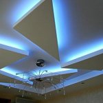 Если компактная комната, то увеличения можно достичь за счет использования многоуровневого потолка. Подсветка по периметру всего потолка делит визуально пространство, привнося оригинальность в помещение.