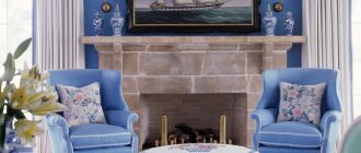 в сочетании с коричневым, песочным цветом. Недопустимо использование предметов старой мебели и техники. Яркие цветовые акценты допускаются лишь в том случае, если они будут гармонировать с общим убранством помещения.