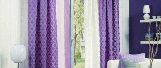 На практике это может выглядеть следующим образом: стены, напольное покрытие, тумбочки и полки – бежевого или коричневого цвета. Предметы мебели и шторы оформлены в сиреневой гамме. А яркие акценты представлены в виде изящного ковра, диванных подушек, одной большой напольной вазы в небесно-голубой или желтой расцветке на фото.