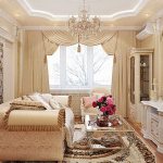 Особой роскошью и обилием позолоченных элементов обладает классическое направление. Кухню-гостиную оформляют в пастельной оттеночной гамме. Для стен применяют штукатурку или дорогие обои с неброскими узорами, потолок украшают лепниной и дополняют шикарной люстрой. В качестве зонирующих элементов уместно использование колонн или ажурных арок. Классика характеризуется дорогими мебельными конструкциями, сделанными из древесины и натуральной обивкой в комбинации с богатым оформлением оконных проемов.