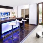- Для маленького помещения неплохим решением может стать зеркальный фартук. Он визуально расширит пространство. Если превращать рабочую зону в зеркало кажется слишком смелым решением, то можно легко комбинировать глянцевую и матовую поверхность.