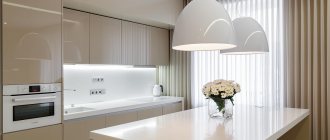 Everything is as concise as possible. No frills or negligence in design. The facades of the furniture, countertops and furniture in the dining area should be smooth, in the same color and perfectly clean.