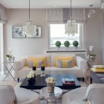 During the daytime, the living room, decorated in a minimalist style, should be literally flooded with natural light. This is possible if there are glazed roof areas and wide windows decorated with translucent blinds.