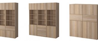 If you need not only open shelves, but also closed cabinets, a combination cabinet may be the solution. Many furniture manufacturers offer custom-made production of such furniture, so you can decide for yourself the number and type of drawers, door design and other parameters. As a result, you can get very original shelving for the living room, in which you can not only display beautiful books and souvenirs, but also hide documents and other personal items from prying eyes.