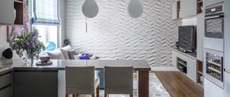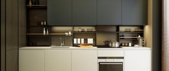 To ensure the completeness of the composition, additional lightweight materials are used in the form of drapery, matched to the color of the kitchen walls and curtains or blinds. The same colors or materials can be used in the design of windows in the living room.