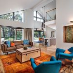 The combination of red furniture and white walls results in a harmonious and bright interior design that visually enlarges the ceiling. In this case, it is considered acceptable to use bright spectral shades.