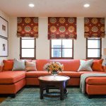 Carpets with graphic patterns in gradient shades add coziness to this minimalist interior. Sand-colored curtains made of thick fabric drape the windows, and on the wall of a neutral beige tone hangs a picture of modern painting in tones that repeat the main colors of the interior.